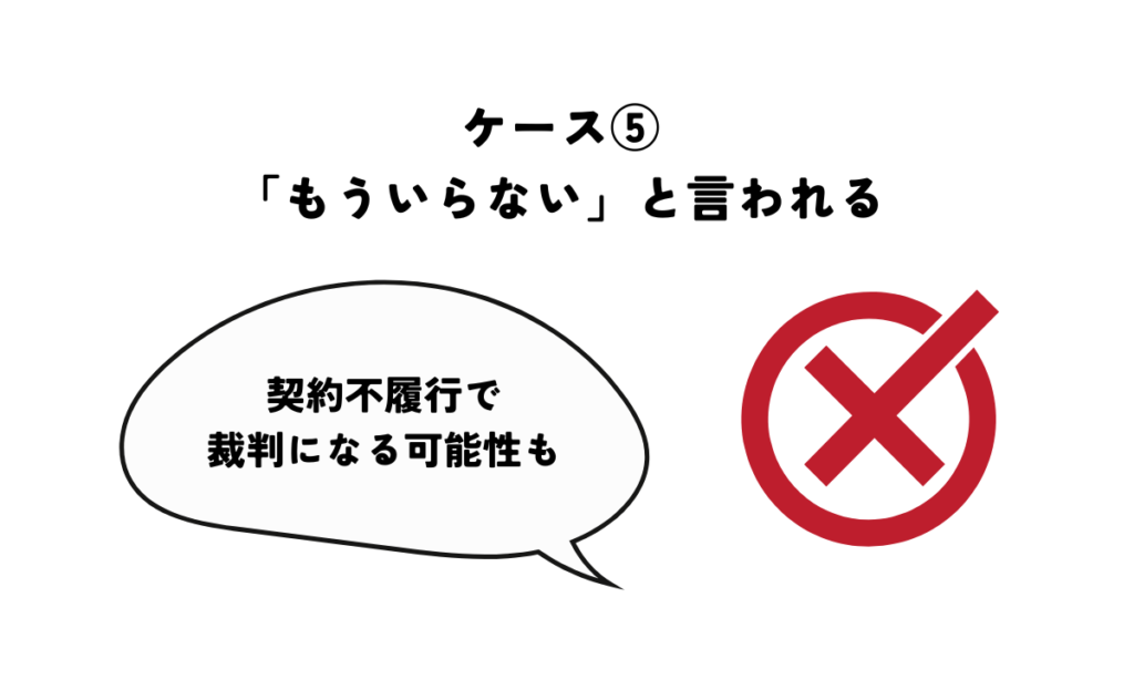 対策:まずは契約の履行を促すこと。メールやメッセージでのやり取りはすべて証拠になるので、契約破棄されたやり取りや当初の契約内容がわかるものを保存しましょう。